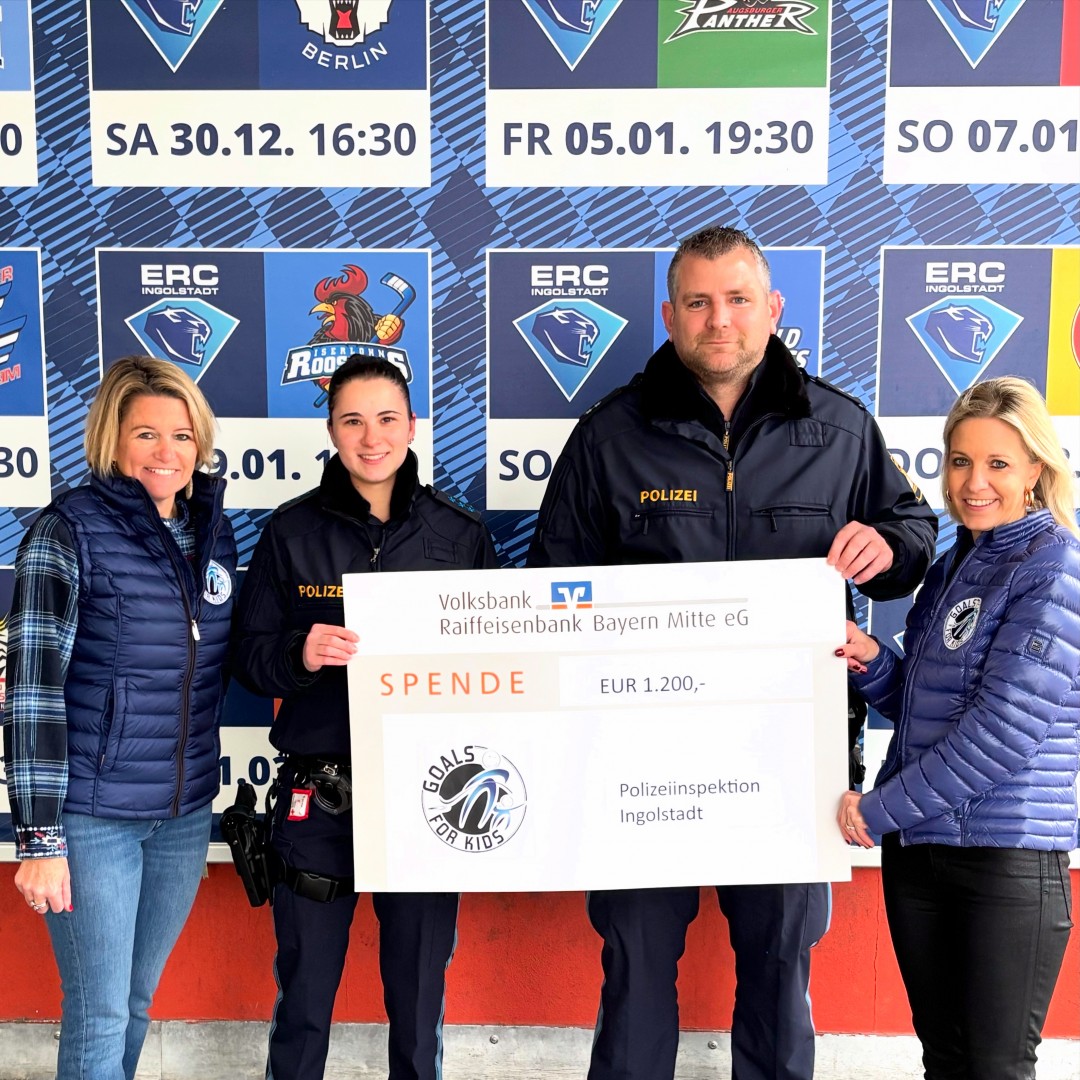 Übergeben wurde der symbolische Scheck an die beiden Vorsitzenden von Goals for Kids Steffi Praunsmändtl und Stefanie Büchl von Polizeioberkommisar Martin Geitner und seiner Kollegin Melina Prawda.