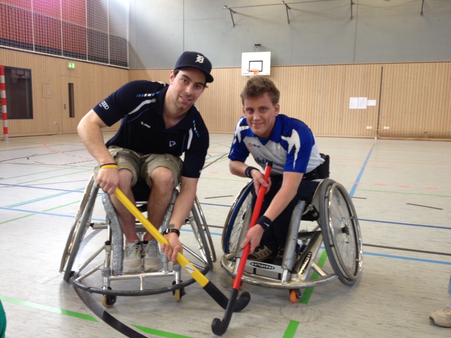 Zur Überraschung aller kam dieses Jahr in der Mittagspause „Xaver", das Maskottchen des ERC Ingolstadt Eishockeyclubs zu Besuch und brachte zur Verstärkung ERC-Verteidiger Derek Dinger mit. Nach lebhafter Begrüßung durften die Eishockeycracks zu einem Hockeyspiel im Rollstuhl Playtz nehmen. „Xaver" durfte wegen der doch unpraktischen Bekleidung für den Rollstuhlsport das Tor hüten. Und Derek konnte feststellen, dass Rollstuhlfahren, dabei einen Hockeyschläger halten und auch noch einen Puck treffen und in die richtige Richtung spielen gar nicht so einfach ist. Nach einer „wilden" halben Stunde, mehrfachem fliegenden Wechsel und einigen Toren für und gegen „den ERC" wechselten die jungen Leute dann wieder zum Rollstuhlhandball. So konnten die Gäste vom ERC die Rollstuhlfahrer in ihrem eigentlichen Element, dem Handballspielen bewundern.